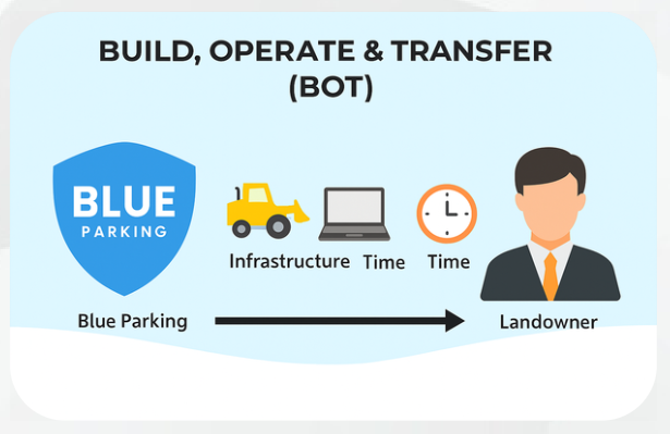 Blue Parking membangun sistem parkir lengkap (infrastruktur, peralatan, teknologi), mengoperasikan dalam jangka waktu tertentu, lalu menyerahkan kepada pemilik lahan setelah periode kerjasama berakhir.